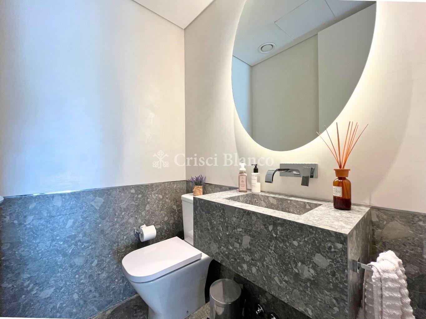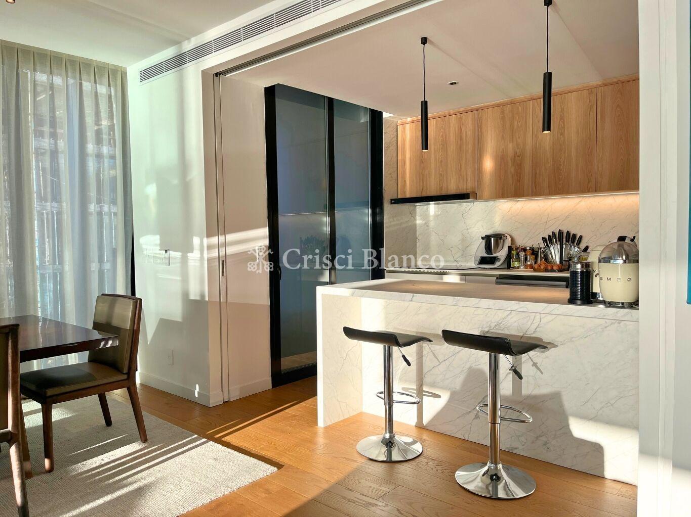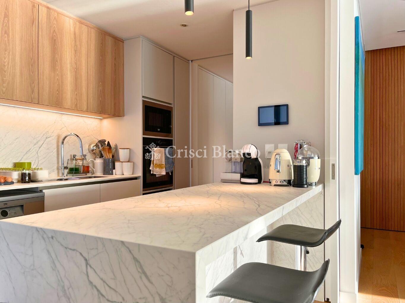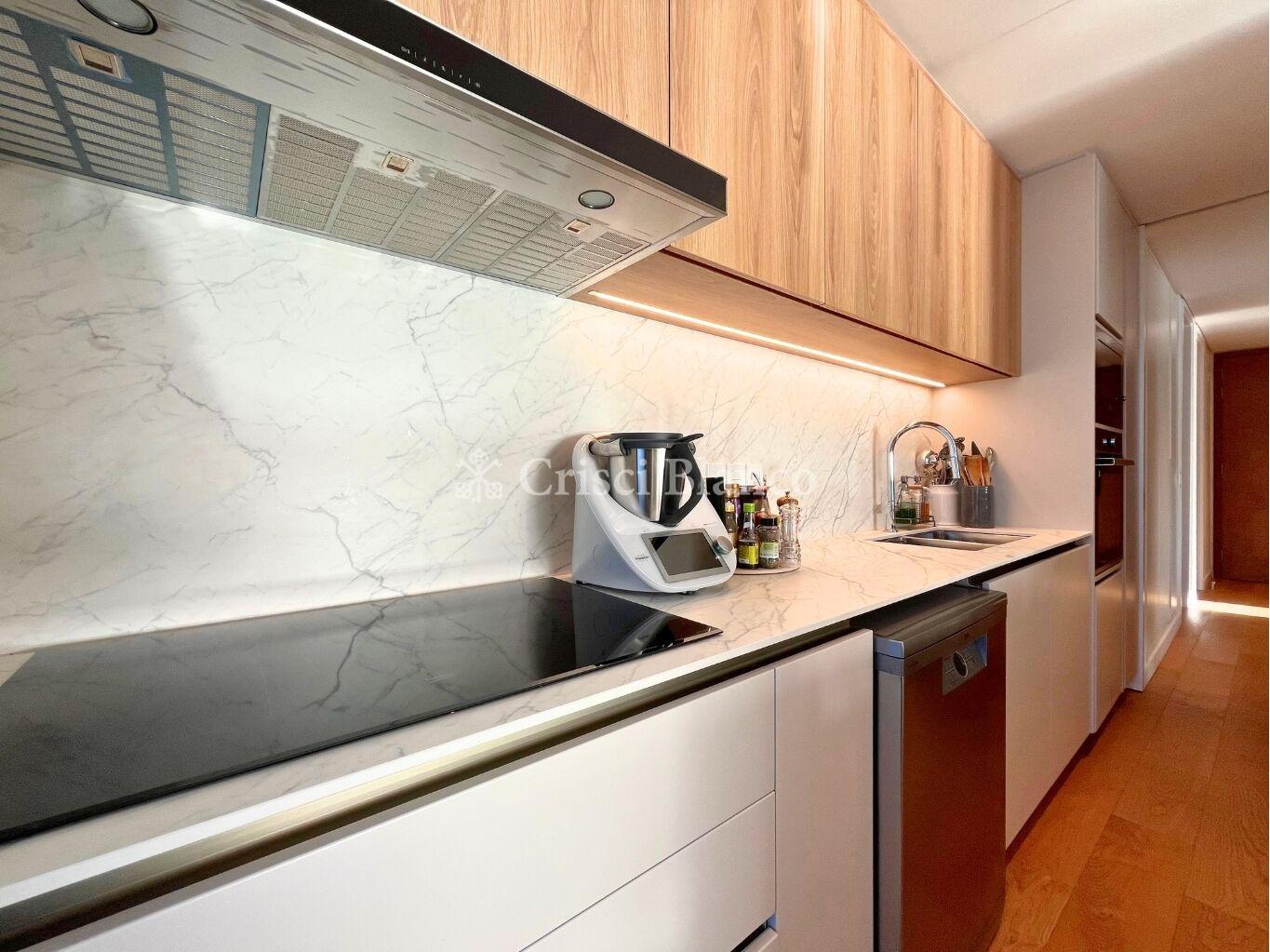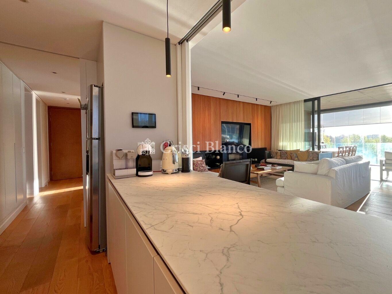 Cocina integrada al área social con gran barra desayunadora, horno, microondas, campana y anafe empotrados. Terraza de servicio.