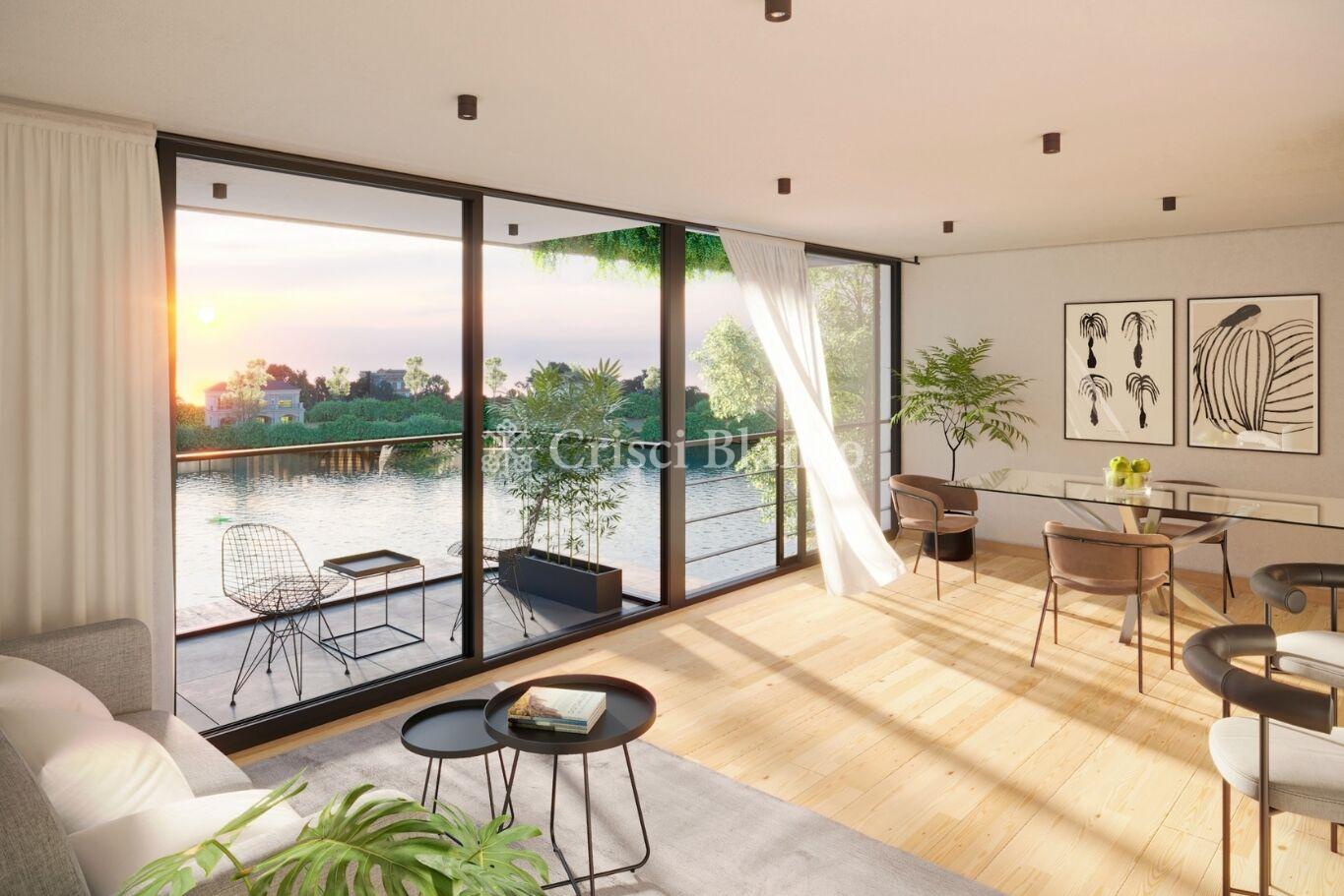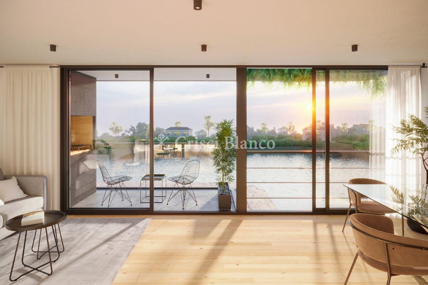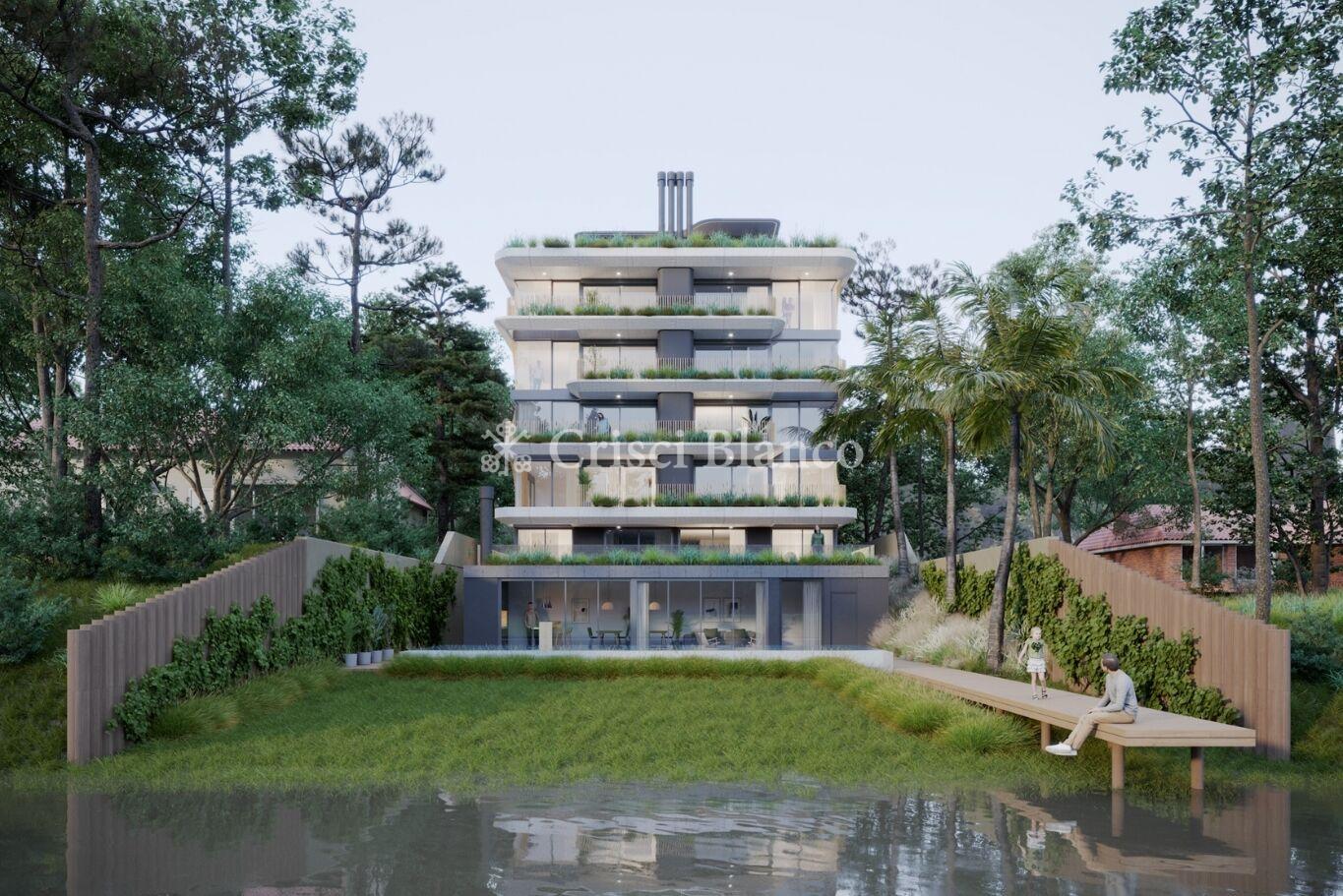 Apartamento planta baja de 2 dormitorios, 65 m2 internos y 56 m2 de terraza. Orientación noroeste con espectaculares vistas despejadas hacia el lago.