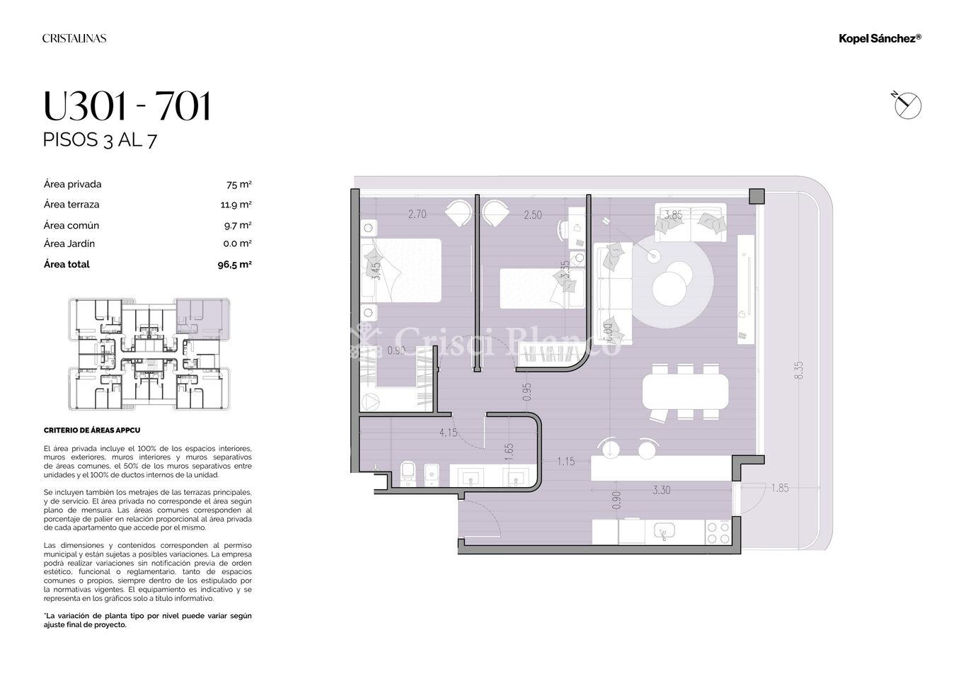 Torre Amatista - Planta de 75 m2 internos y 12 m2 de terraza - Orientación sureste.
