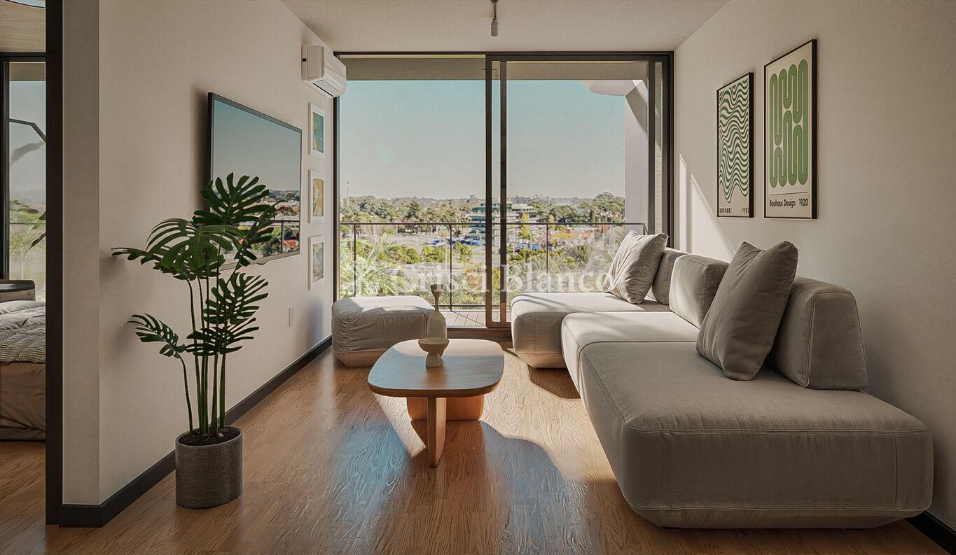 Living comedor luminoso, cocina integrada. Terraza con vistas despejadas hacia el Arroyo Carrasco.