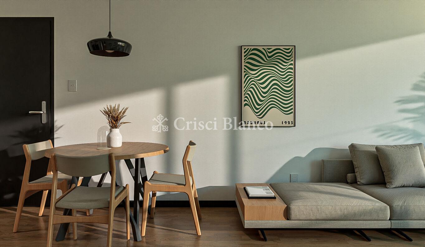 Living comedor luminoso, cocina integrada. Terraza con vistas despejadas hacia el lago.