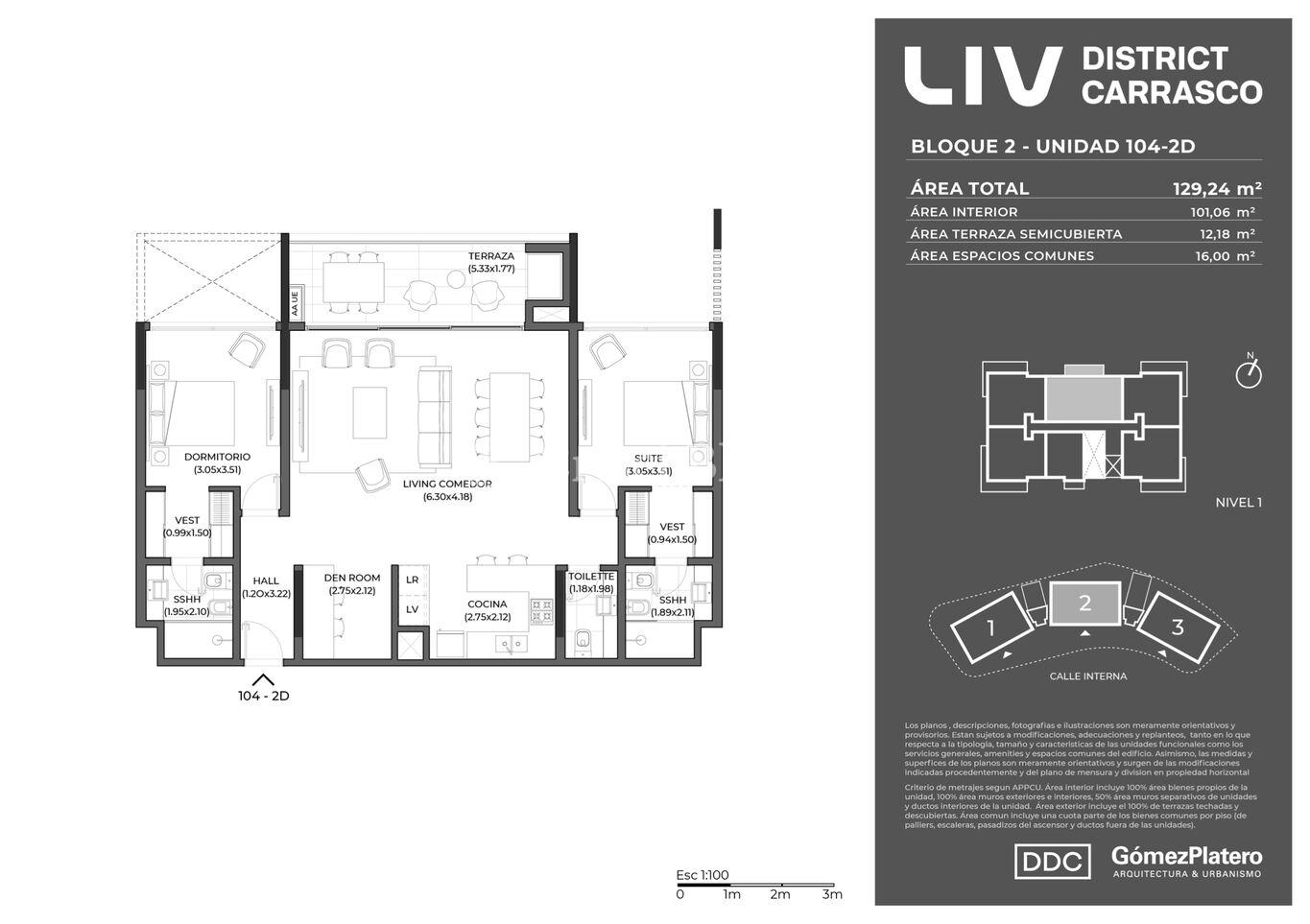 Espacioso apartamento de 2 dormitorios de 101 m2 internos y 12 m2 de terraza. Orientado al norte.