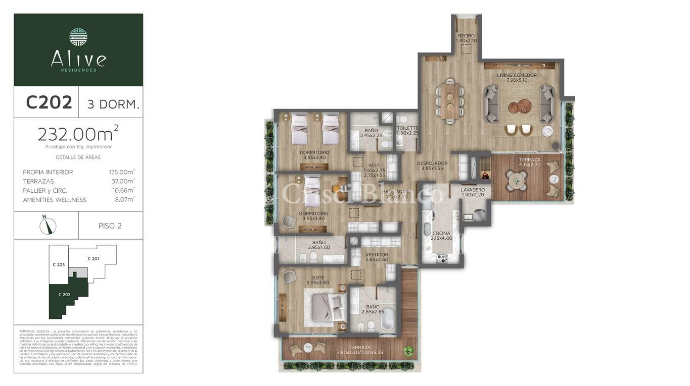 176 m2 internos y 35 m2 de terrazas.