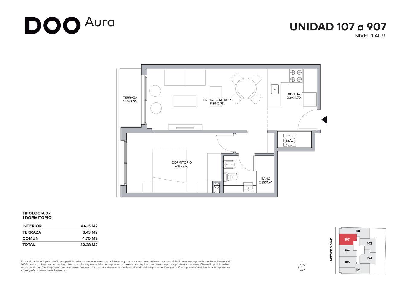 Unidad al frente hacia Acevedo Díaz, 44,15 m2 internos y una terraza de 3,43 m2.