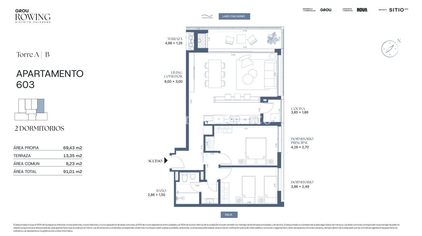 Dos dormitorios, cada uno con sus respectivos placares. 1 baño completo compartimentado.