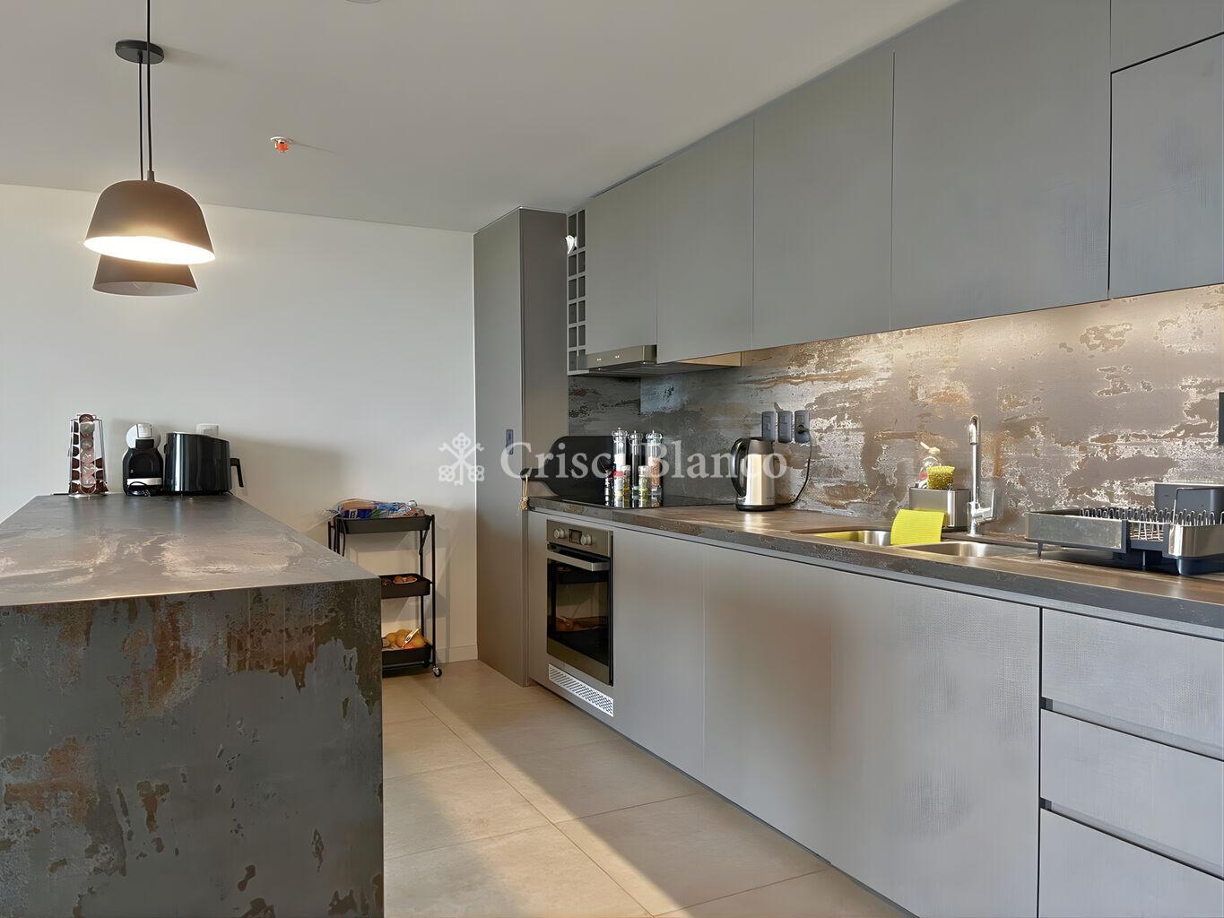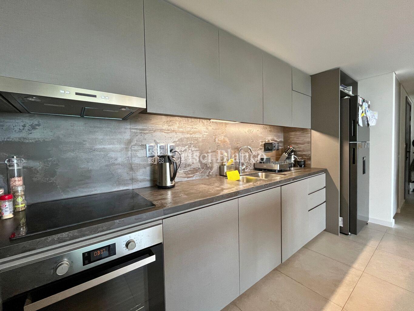 Cocina integrada con barra desayunadora, horno, anafe y campana empotrados.