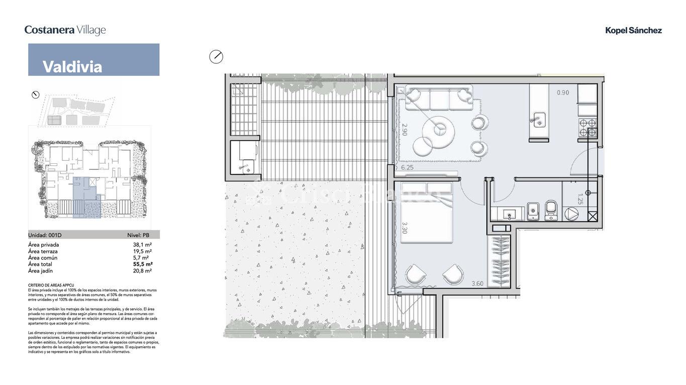 Village Valdivia. 38 m2 internos, 19,5 m2 de terraza y 20 m2 de jardín.