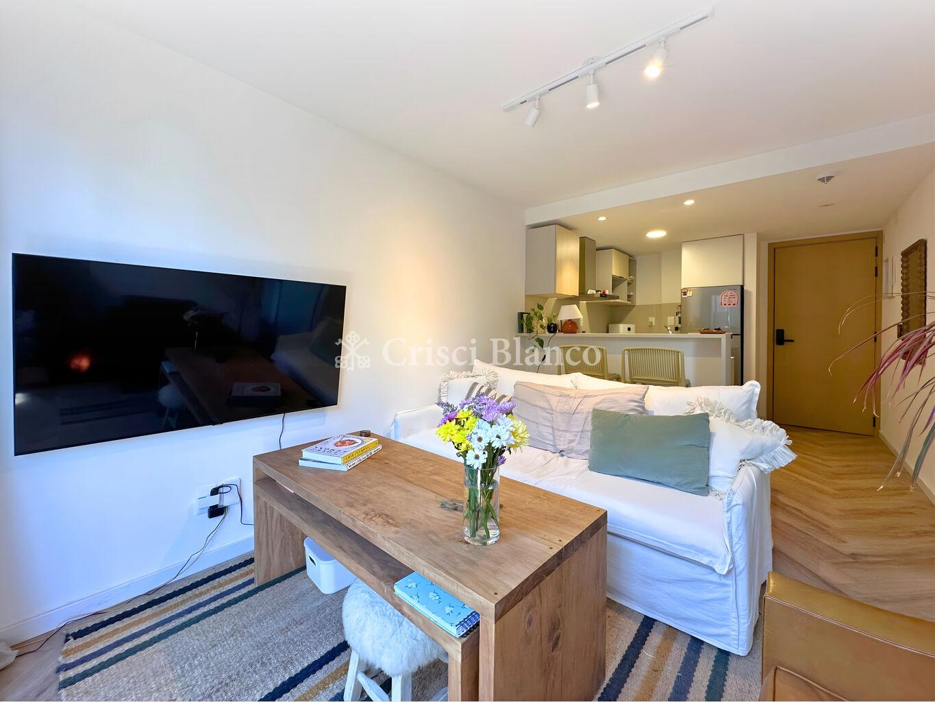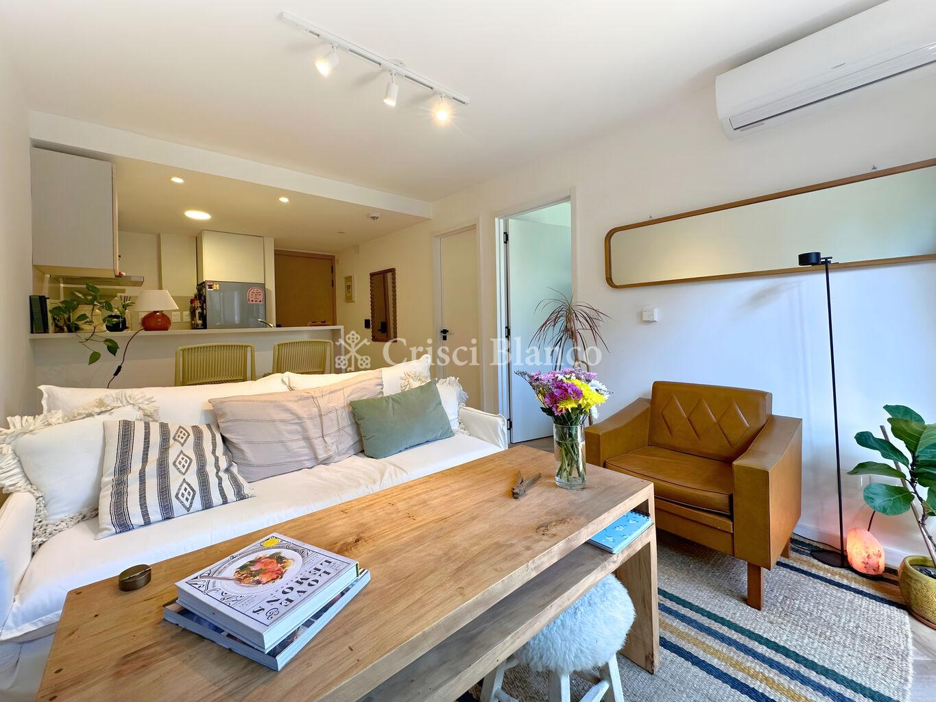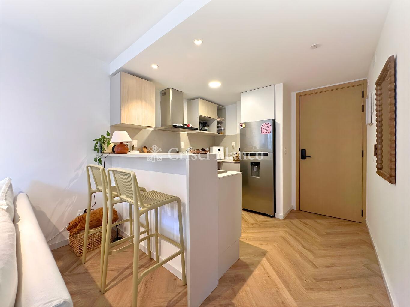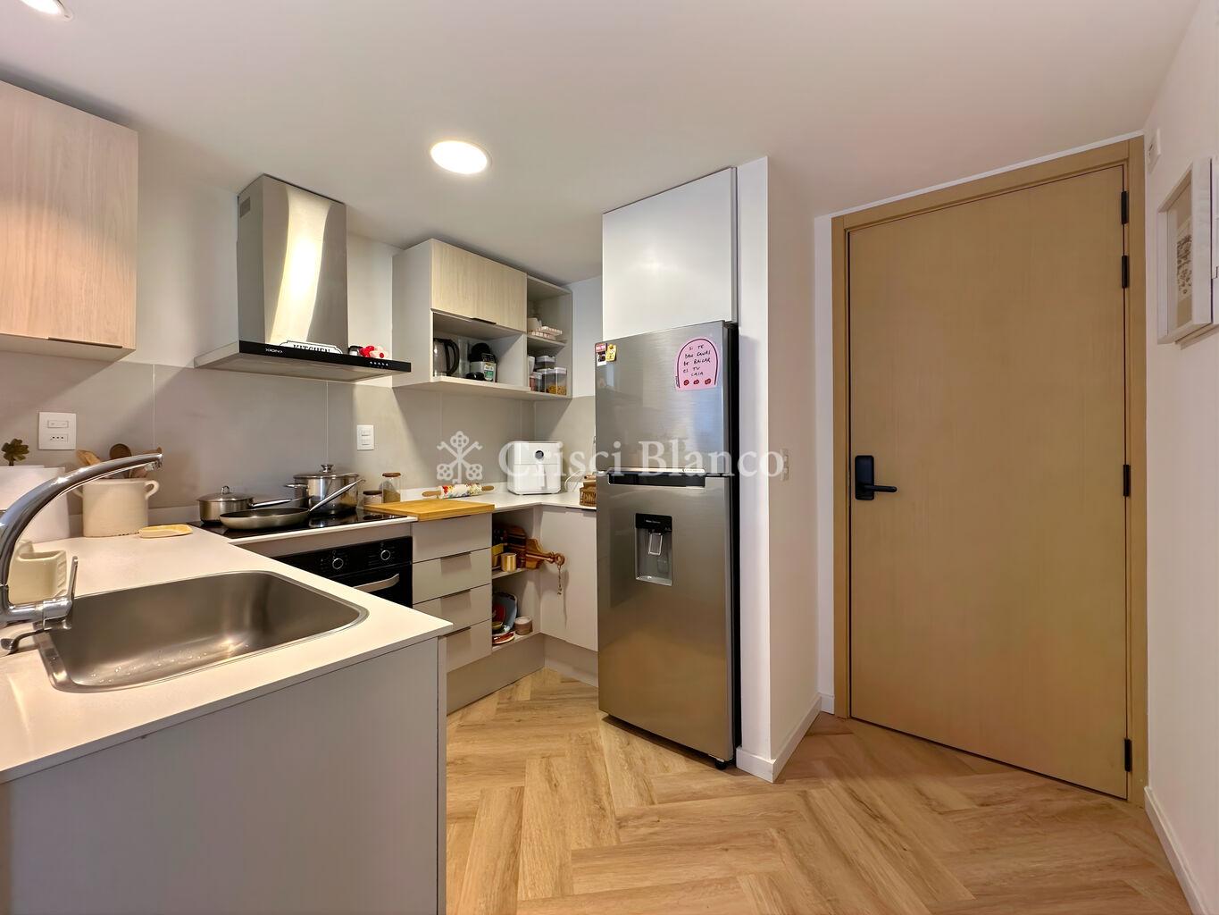 Living luminoso con cocina semi integrada, equipada con horno, campana y anafe, además cuenta con una cómoda barra desayunadora.