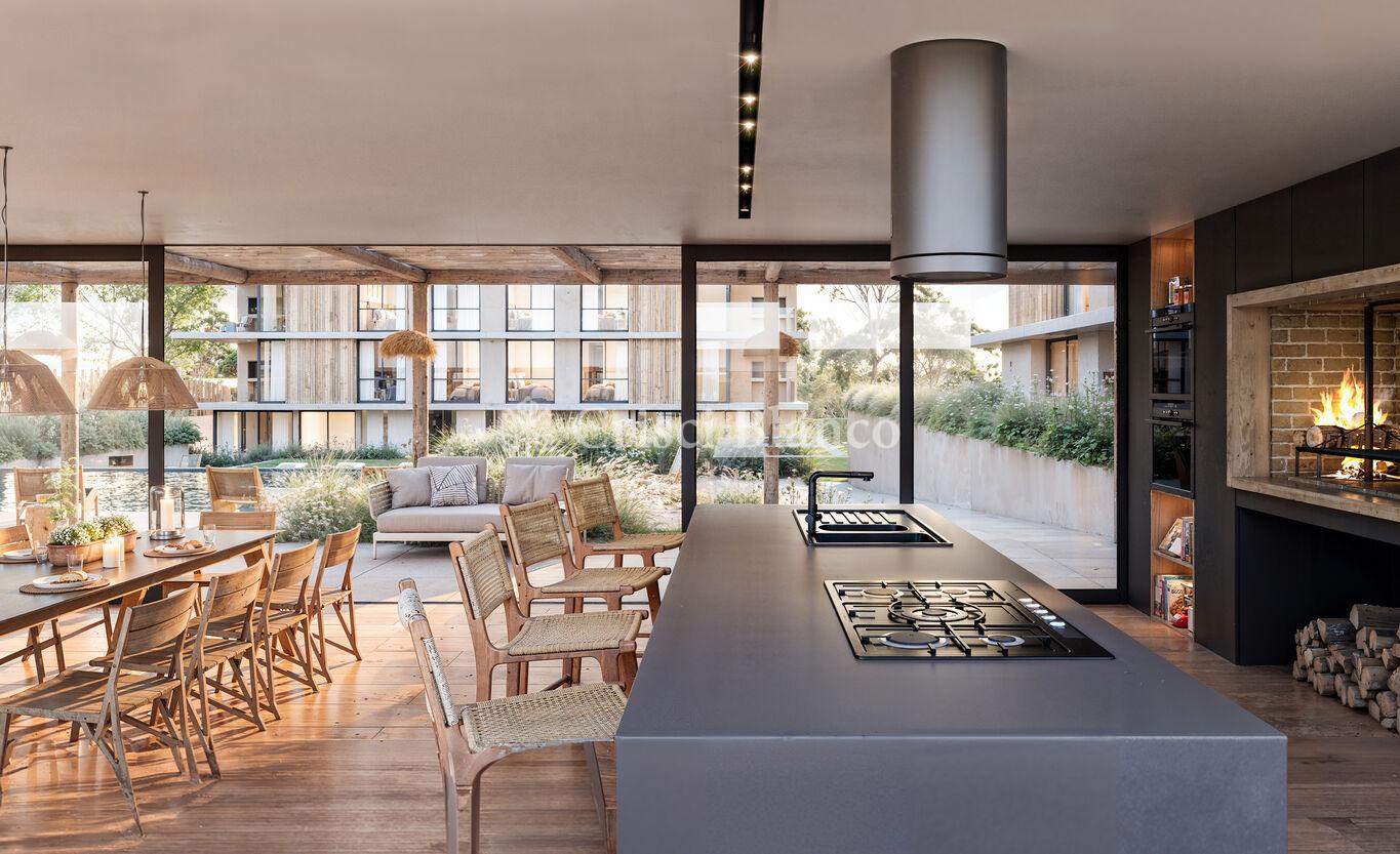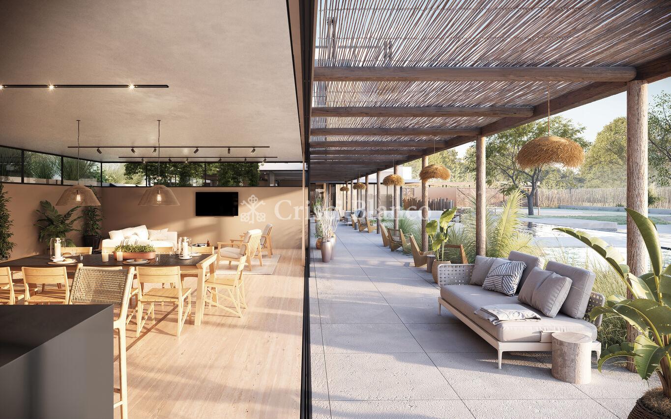 Living comedor amplio y luminoso con acceso a terraza con parrillero. Cocina integrada con barra, horno, campana y anafe.