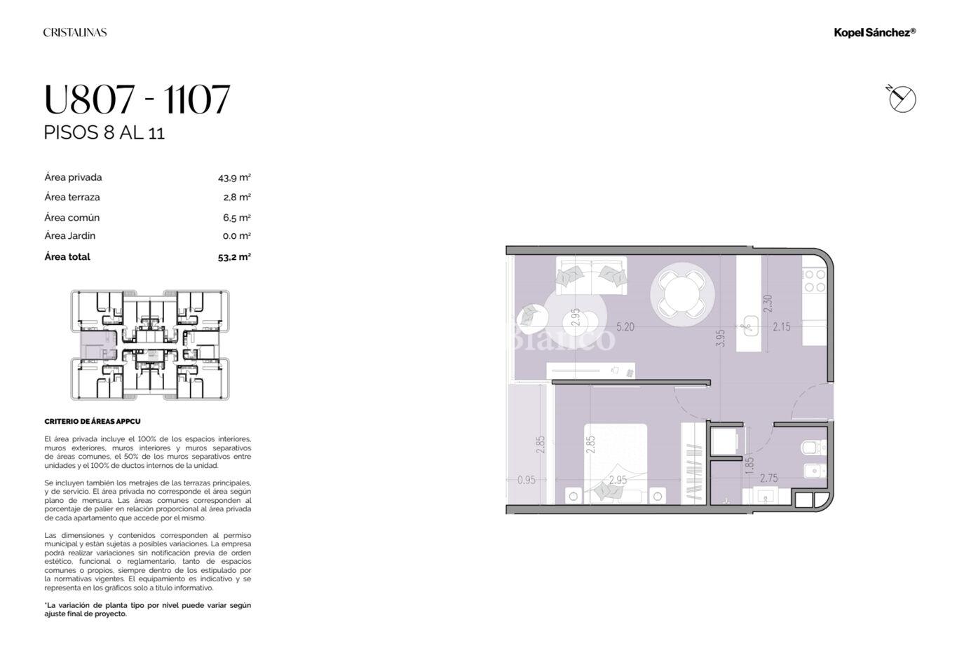 Torre Amatista - Planta de 44 m2 internos y 3 m2 de terraza - Orientación noroeste.
