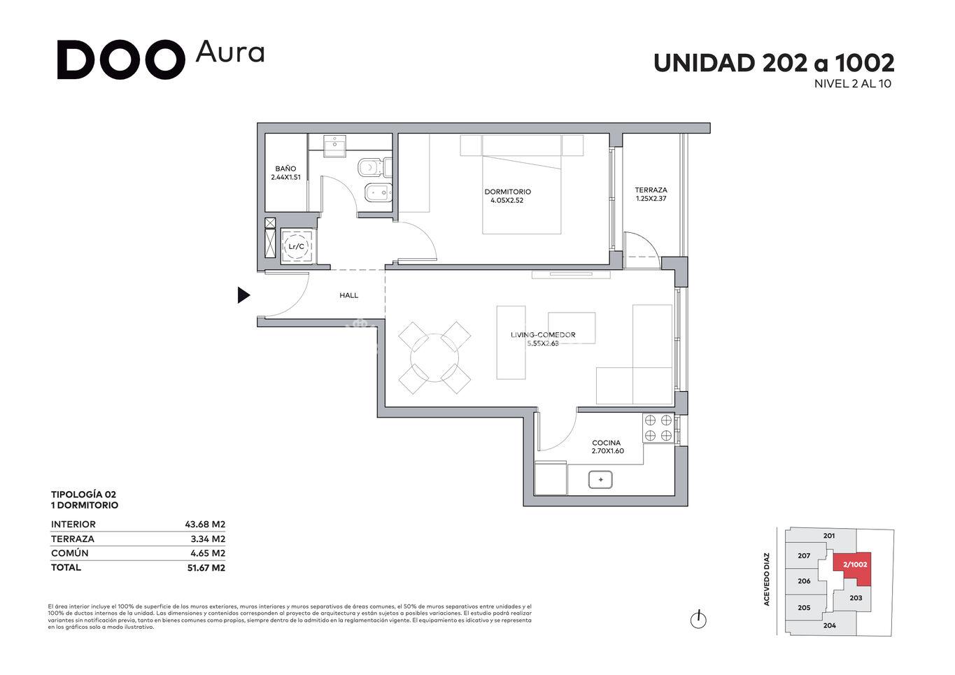 Unidad contrafrente de 43,68 m2 internos y 3,34 m2 de terraza.