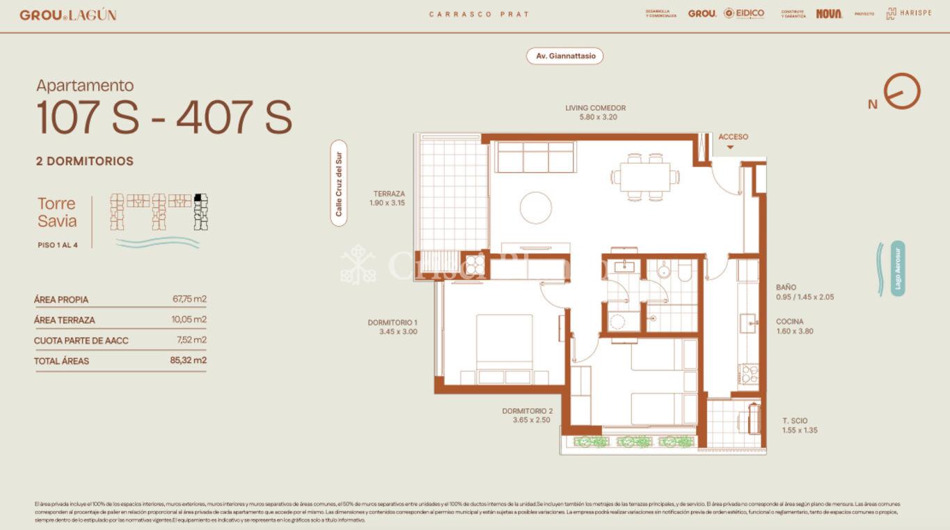 68 m2 internos y 10 m2 de terraza.