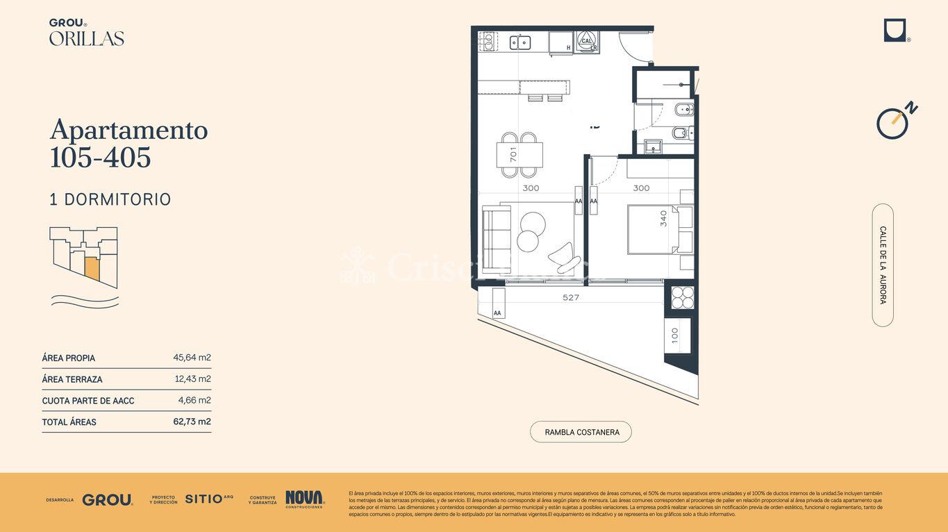 Venta apartamento de 1 dormitorio de 46 m2 interiores y 13 m2 de terraza. Orientación sur.
