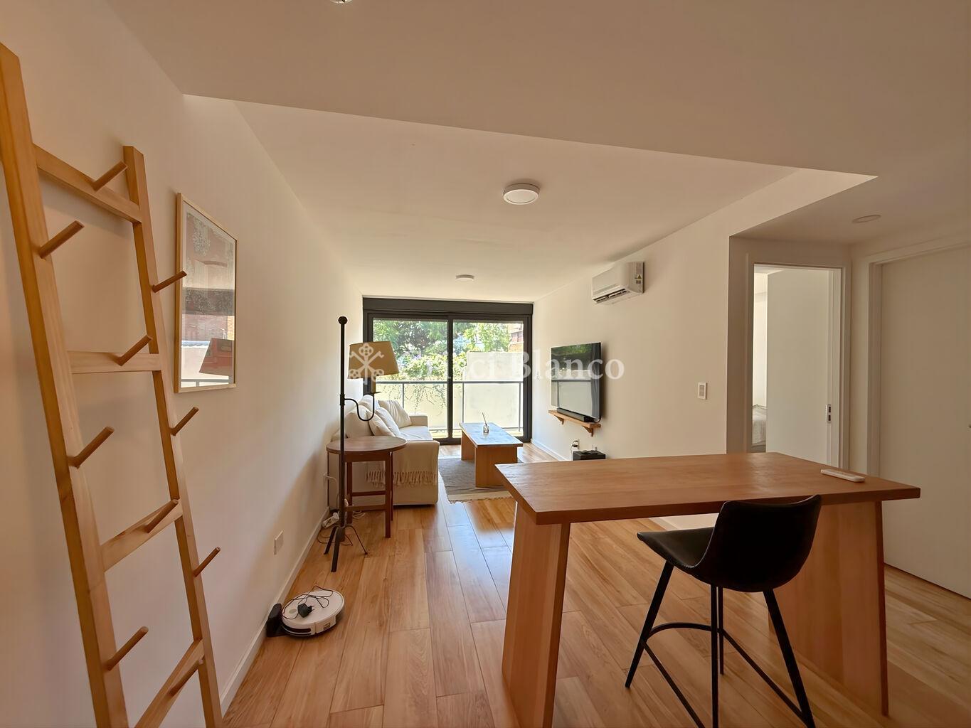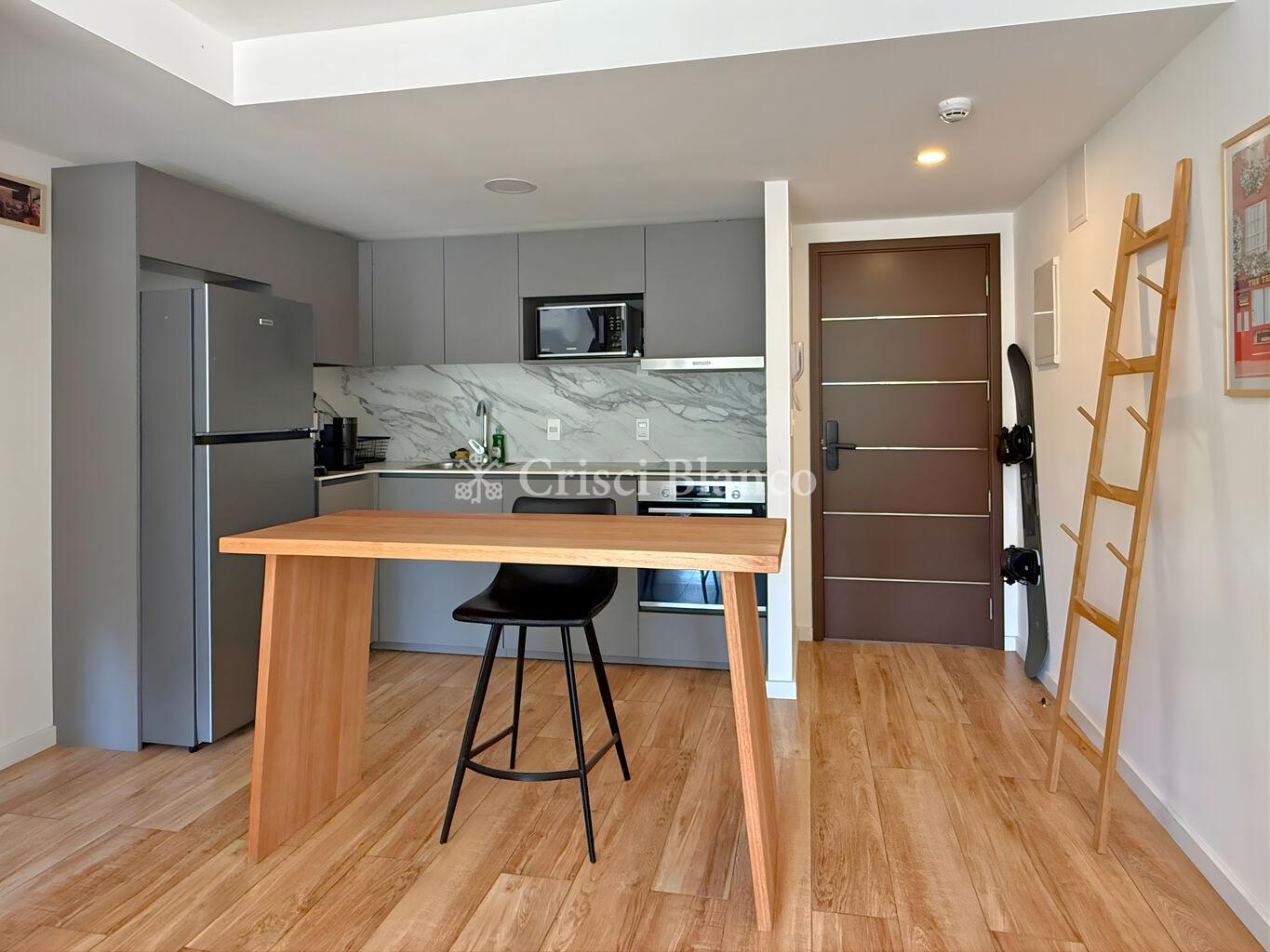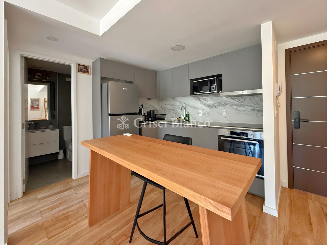 En un edificio nuevo, apartamento de 1 dormitorio de buenas dimensiones, con muy lindo living comedor integrado con cocina moderna. Horno campana y anafe eléctrico.