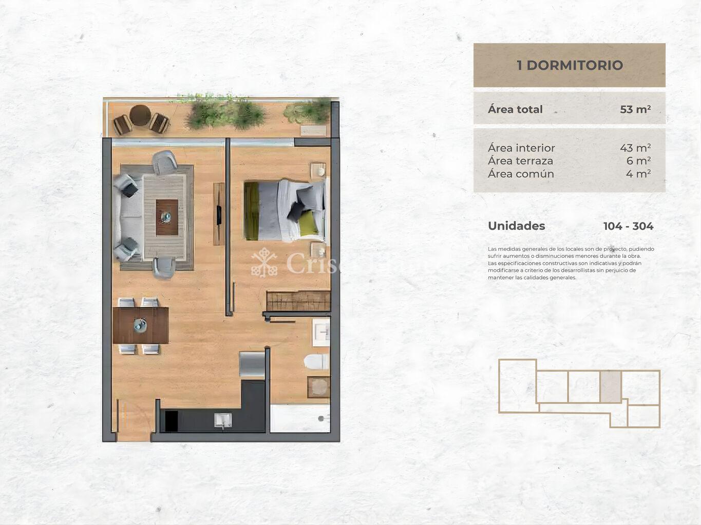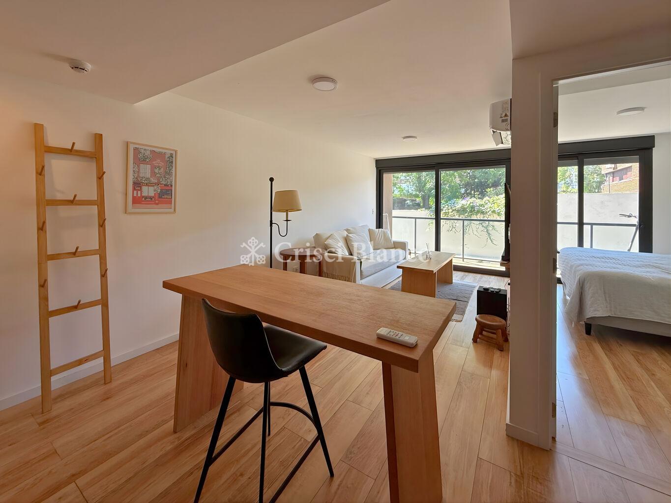 1 dormitorio amplio y baño completo. Salida a terraza tanto de living como desde el dormitorio.