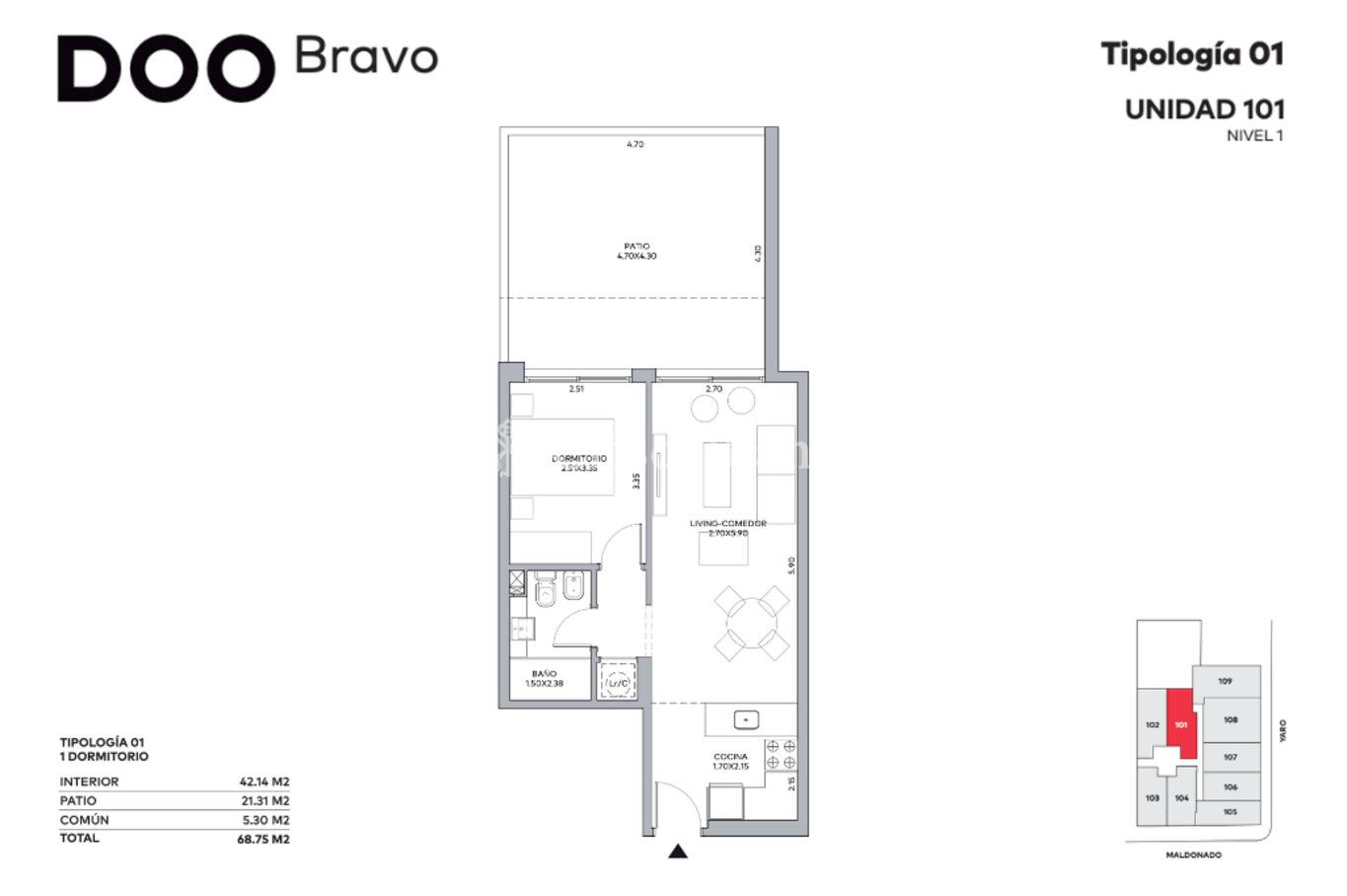 Unidad de 42 m2 internos y un patio de 21 m2. Orientación norte.