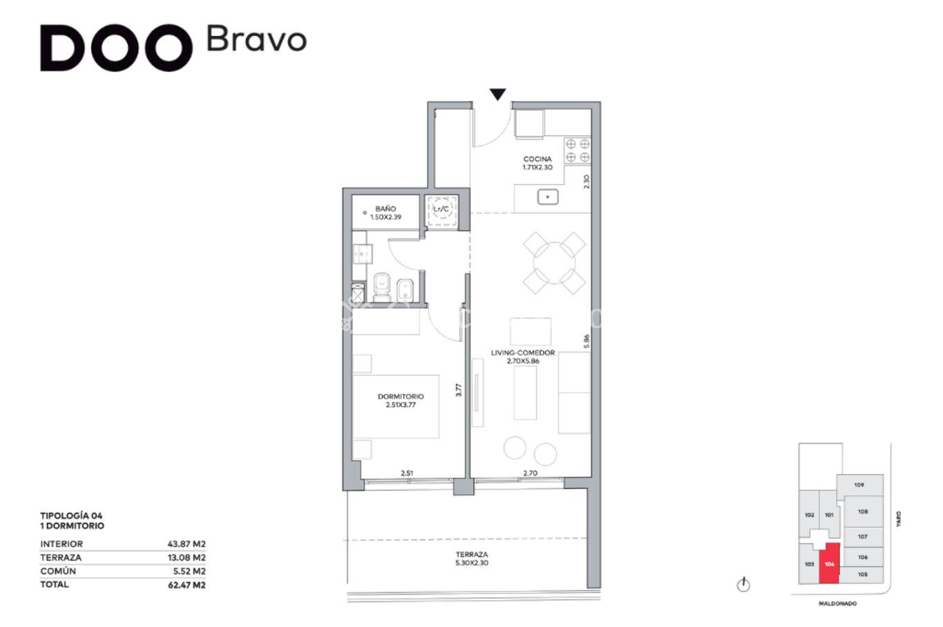 Unidad de 44 m2 internos y una terraza de 13 m2. Orientación sur hacia el frente.
