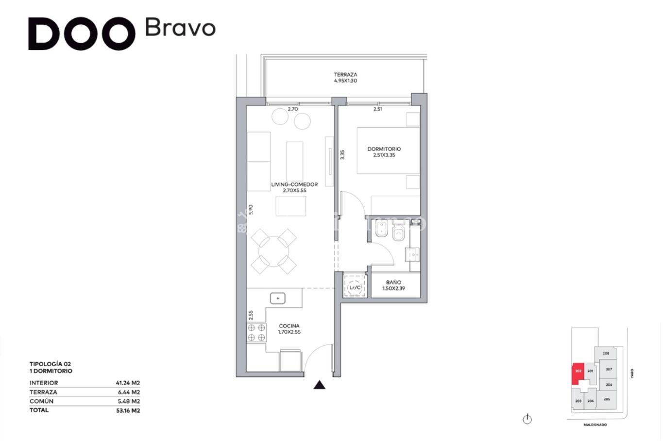 Unidad de 41 m2 internos y una terraza de 6 m2. Orientación norte hacia el contrafrente.