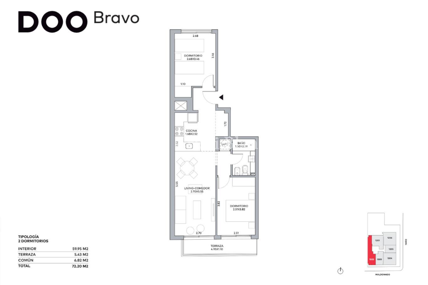 Unidad de 60 m2 internos y una terraza de 5 m2. Orientación sur.