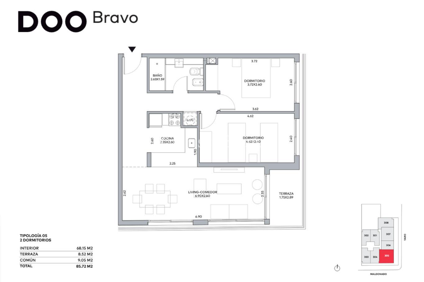 Unidad de 68 m2 internos y una terraza de 9 m2. Orientación sureste.