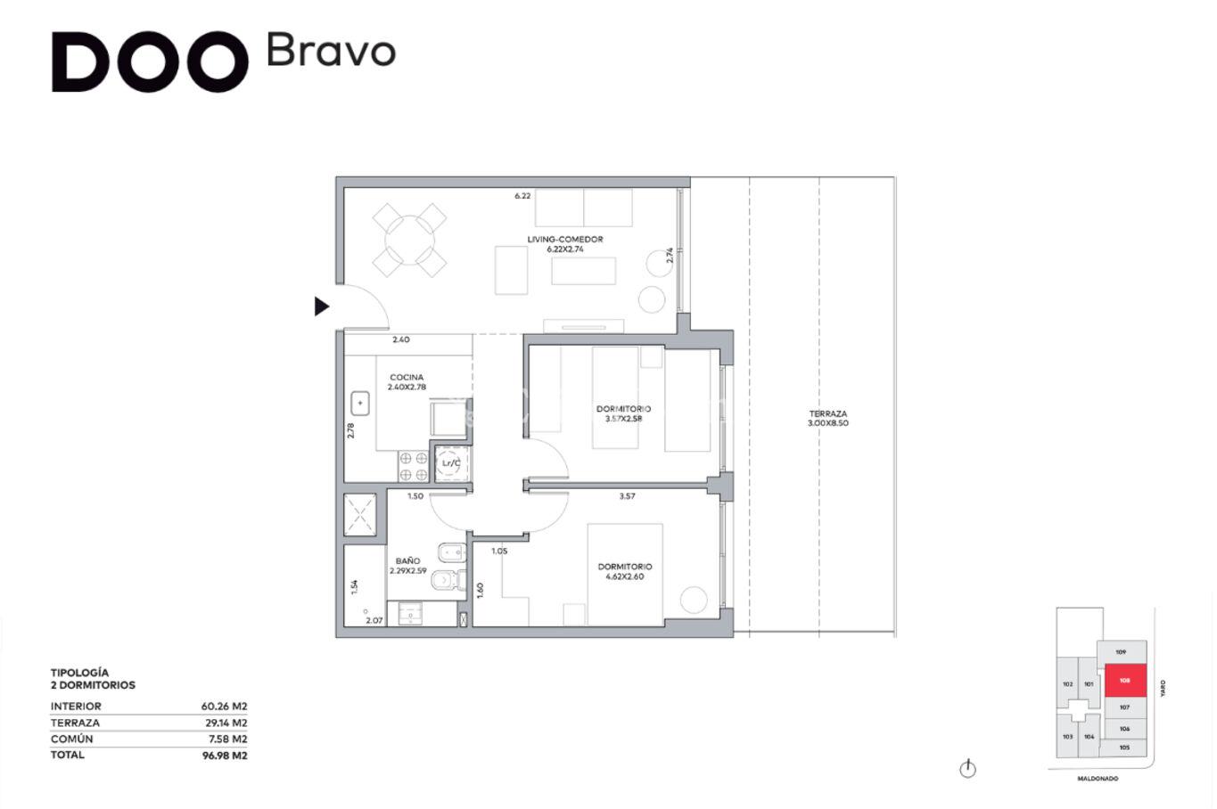 Unidad de 60 m2 internos y un patio de 29 m2. Orientación este.