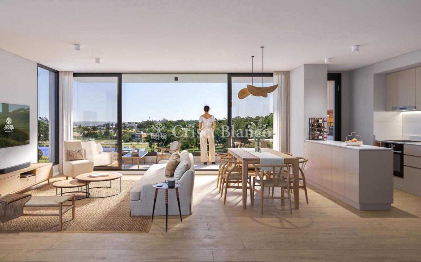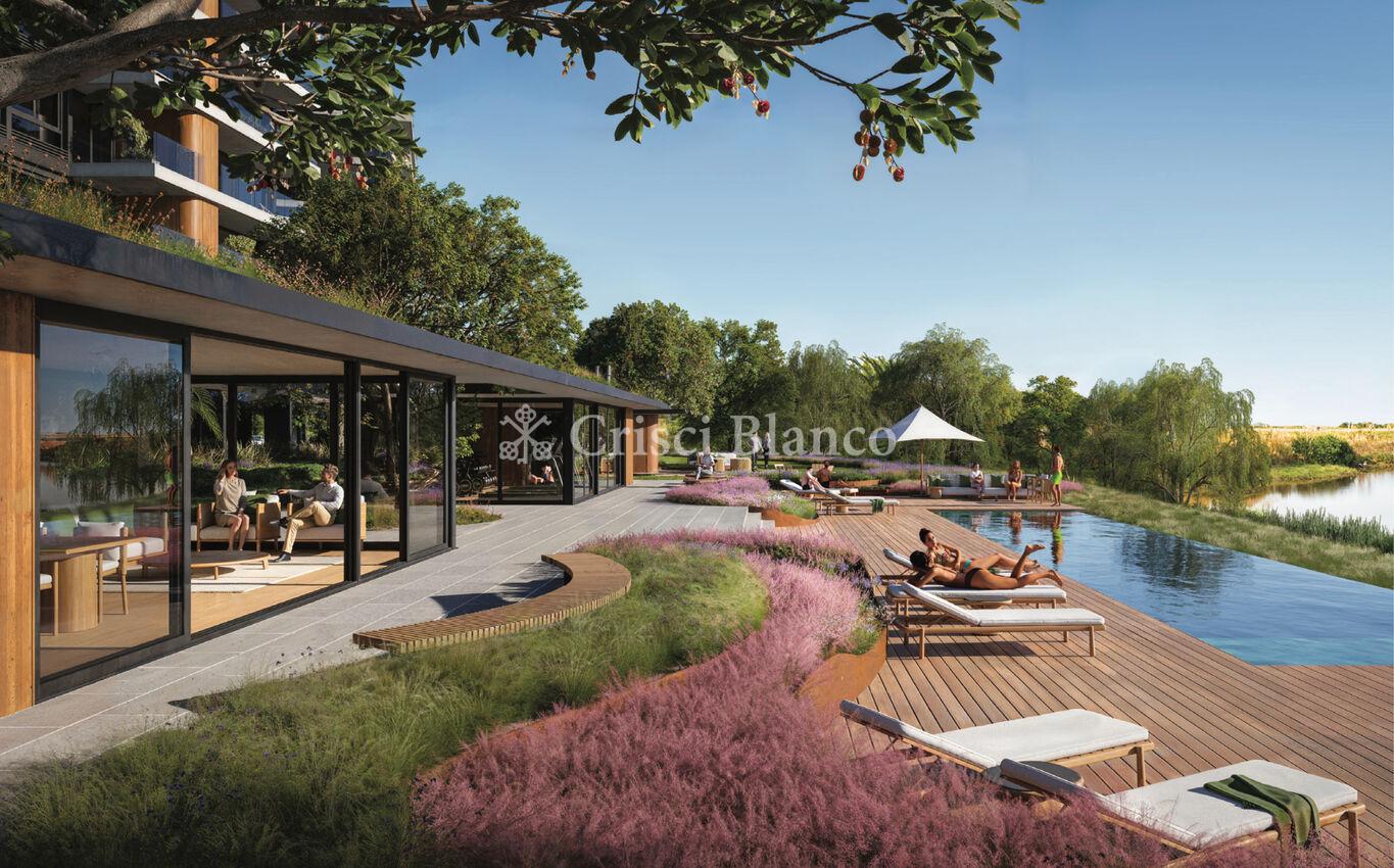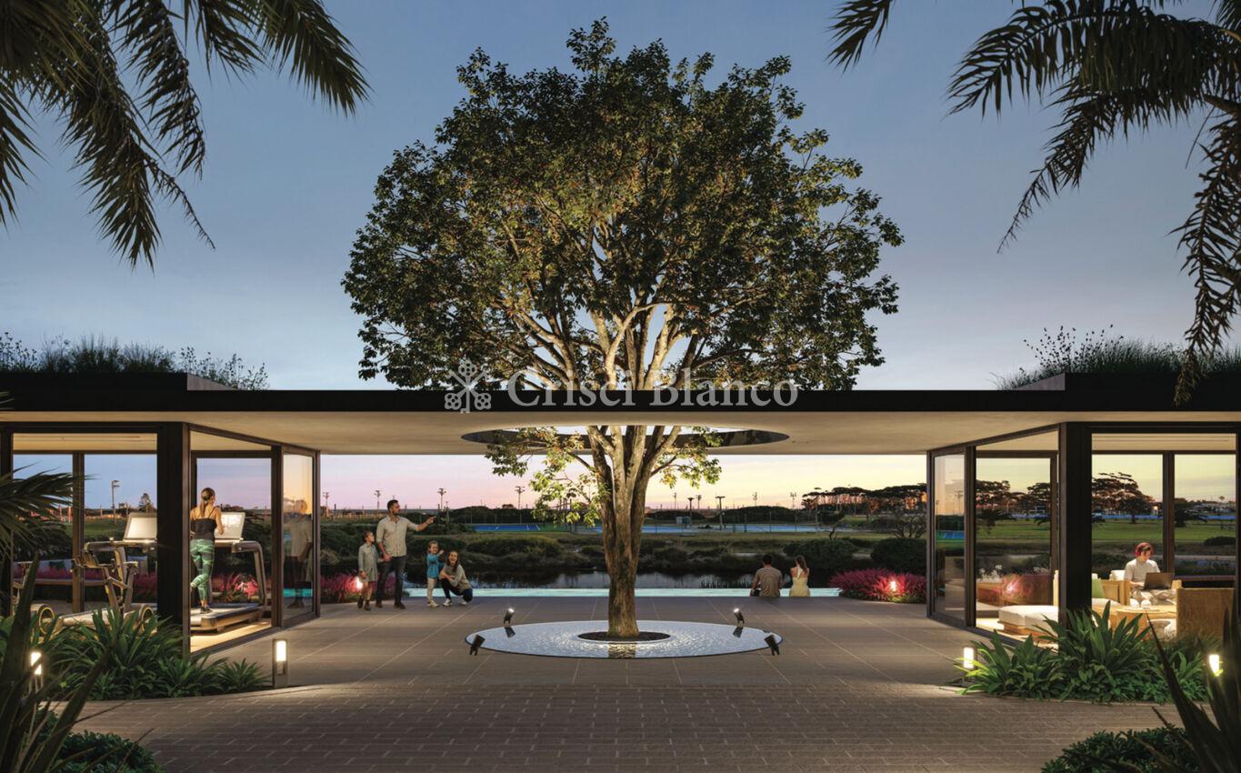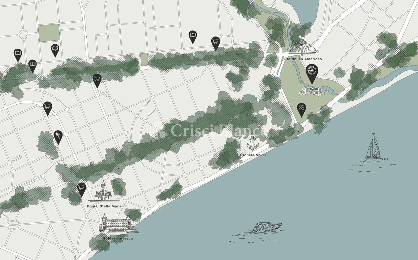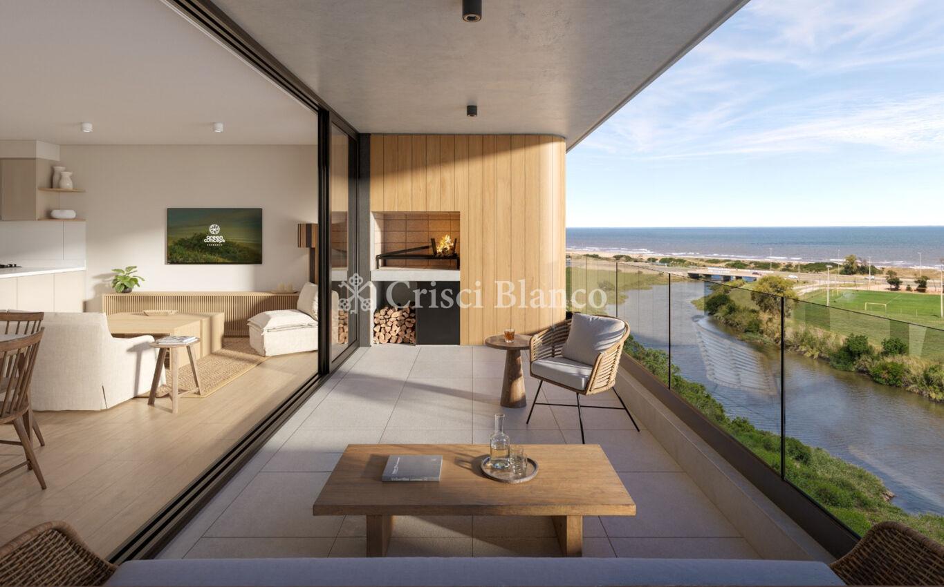 Salida a gran terraza esquinera con parrillero y vistas despejadas hacia el arroyo Carrasco y la rambla.