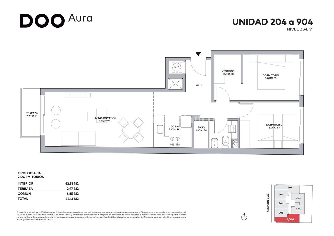 Unidad al frente hacia Acevedo Díaz, 62,51 m2 internos y 2,97 m2 de terraza.